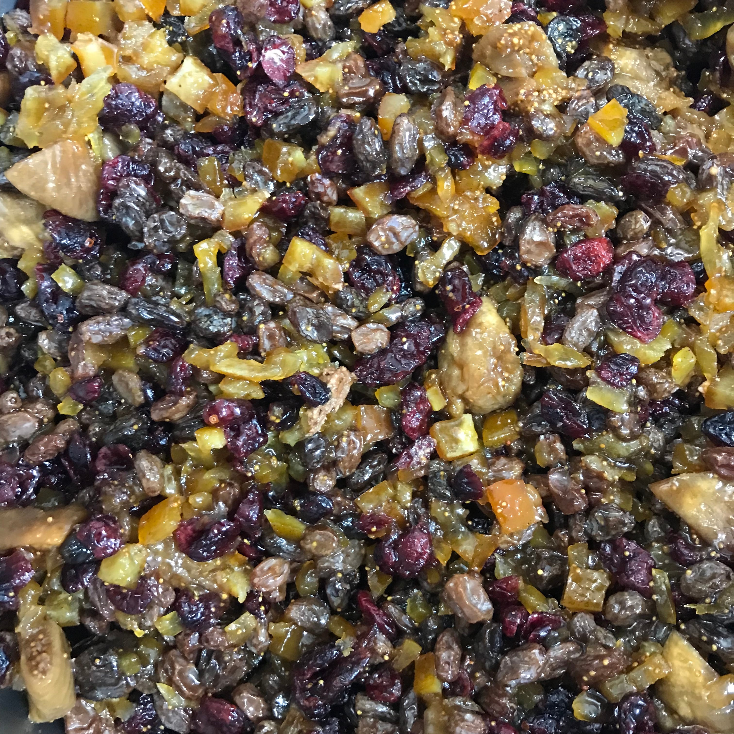 ラム酒とブランデーで有機ドライフルーツを漬け込み、